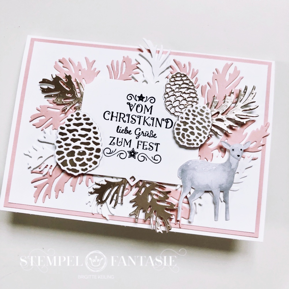 Rosa ist ja sowieso meine absolute Favoritenfarbe. ❤️ Auch an Weihnachten darf sie nicht fehlen. So habe ich die Stanzformen „Zauberhafte Zweige“ in unterschiedlichen Farben (Kirschblüte, FLüsterweiss und Metallic-Folienpapier Champagner) ausgestanzt und auf der Karte drapiert.