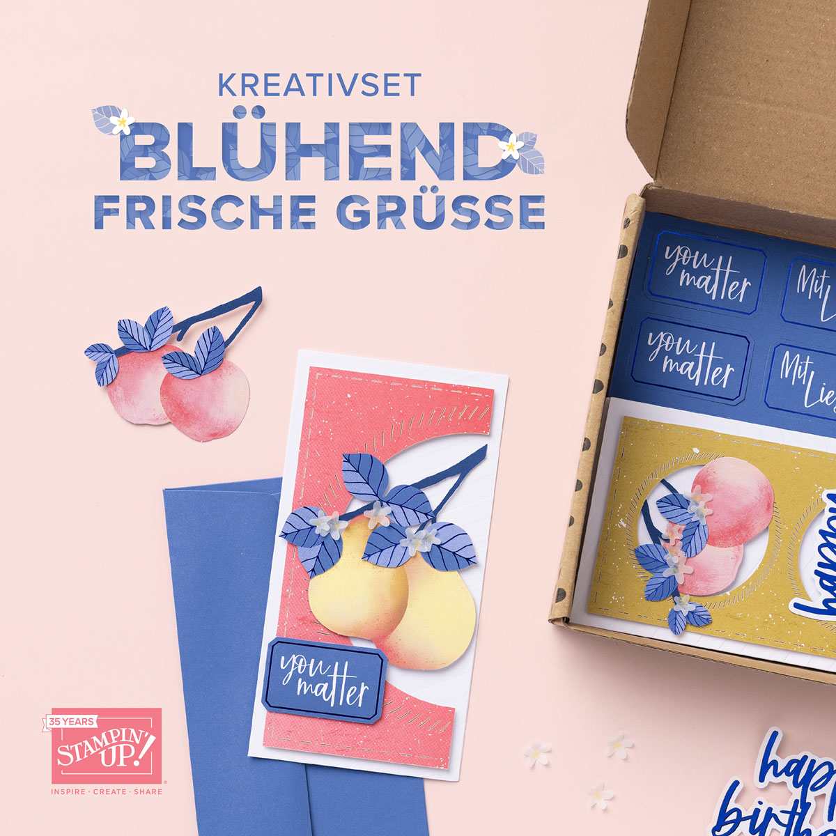 Oft sind wunderbare exklusive Stempelsets enthalten, die Du nur in diesem Set findest. Bei diesem Kreativset haben mich sowohl Farbkombination als auch die Motive mit den Birnen und Äpfeln total angesprochen. Und beides zusammen ist halt einfach mega schön!