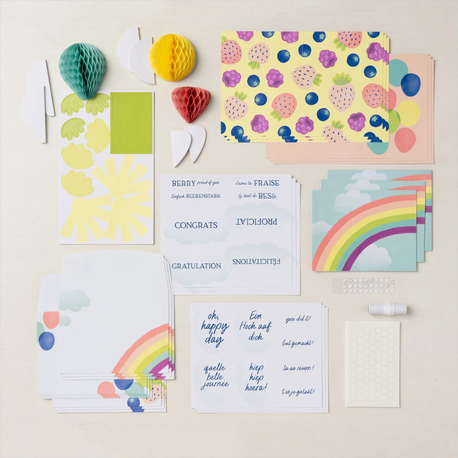 - 9 bedruckte Grundkarten mit Glanzfinish und 9 Umschläge