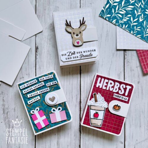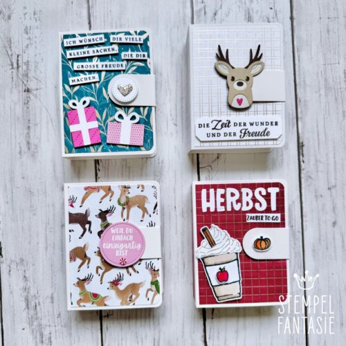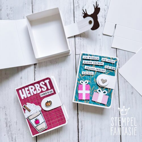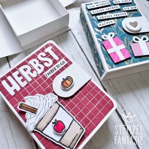 Ich habe mich für eine herbstliche Variante, eine Geburtstagsversion und zwei eher weihnachtliche Boxen (Rentiere) entschieden, die man aber auch zu anderen Anlässen verwenden kann.