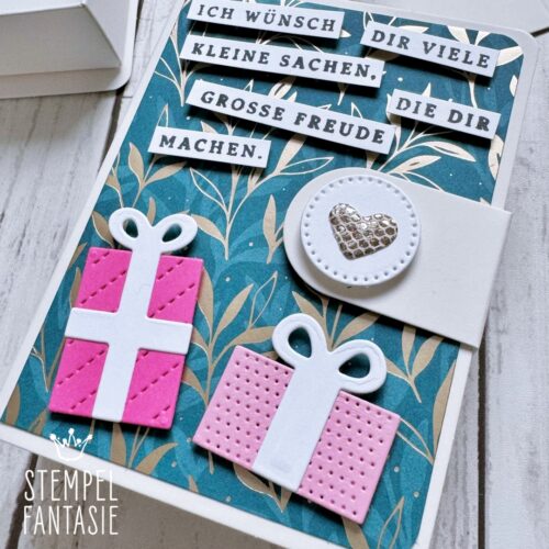 Der Spruch ist zwar aus einem Weihnachtsset, ich finde, der passt aber perfekt zu der Schachtel mit den Geschenken drauf! Die Geschenke sind übrigens aus dem Produktpaket „Fröhliche Rentiere“.