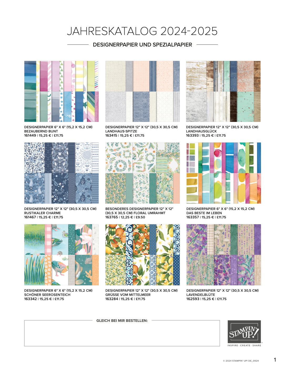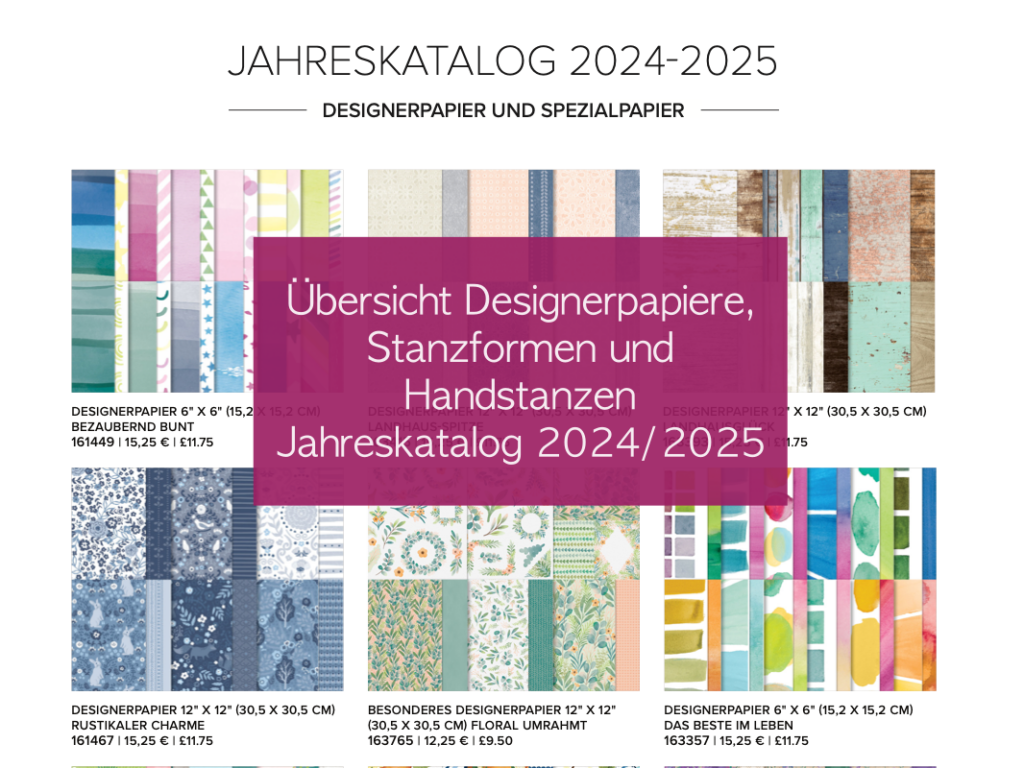 Was mir persönlich gefehlt hat, ist die Übersicht über die einzelnen Designerpapiere. Stampin`Up! hat jetzt eine Datei dazu erstellt, in der Du nicht nur alle Designerpapiere in der Übersicht findest, sondern auch alle besonderen Papiere, Stanzformen und und Handstanzen des Jahreskataloges 2024/2025.