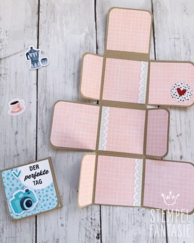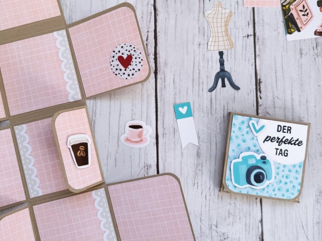 Verwendet habe ich das besondere Designerpapier Zeit für Hobbys. Da sind nicht nur schöne Motive und Muster drauf, sondern es sind auch zwei Bögen mit bereits vorgestanzten Motiven dabei. So kannst Du Dein Album direkt gestalten.